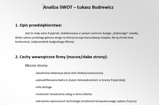 Analiza SWOT – Salon fryzjerski. Dokument: zawierający analizę SWOT małego salonu fryzjerskiego. Program: Microsoft…