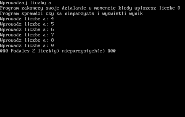 Program: zliczający ilość liczb nieparzystych. Użytkownik podaje liczby aż do podania 0, wtedy program…