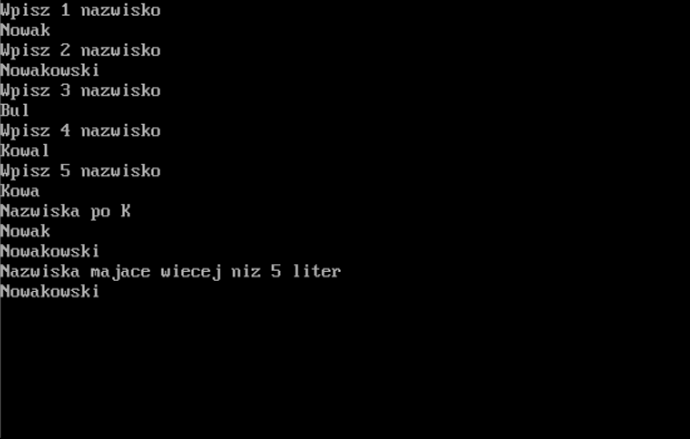 Program: wyszukujący nazwiska zaczynające się po literze “K” oraz dłuższe niż 5 liter. Użytkownik…