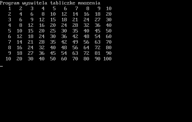 Program: wyświetlający tabliczkę mnożenia 10×10. Wymiary tabliczki są zdefiniowane z góry w kodzie programu.…