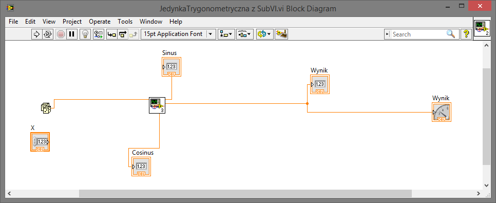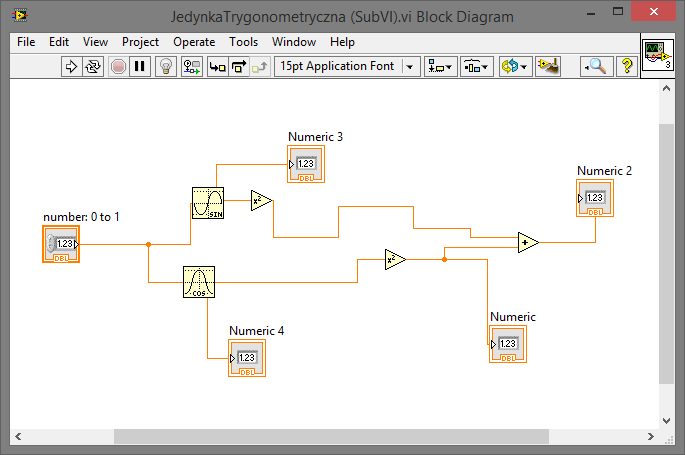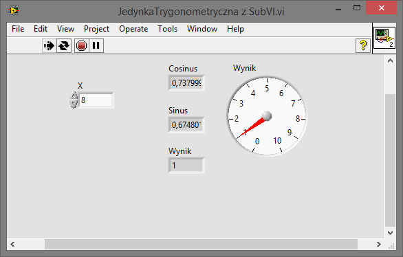 Jedynka trygonometryczna 22/02/2024 LabVIEW Program: obliczający wartości sinus i cosinus dla podanej liczby X. Jak w opisie.Program: LabVIEW Galeria: Front.Schemat blokowy.Schemat blokowy. Słowniczek pojęć: To twierdzenie, które mówi, że dla dowolnego kąta θ spełniona jest zależność sin²θ+cos²θ równa się 1. Jedynkę trygonometryczną można udowodnić, stosując twierdzenie Pitagorasa dla współrzędnych punktów leżących na okręgu jednostkowym x²+y²=1. Jedynka trygonometryczna pl.khanacademy.org Elektronika Program Trygonometria