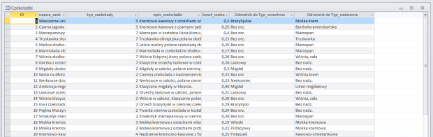 Baza danych: zestawiający czekolady, na której została dokonana normalizacja. Skład bazy danych: 4 tabele…