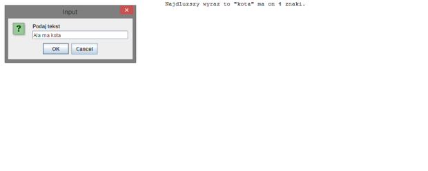 Program: odnajdujący najdłuższy wyraz we wprowadzonym tekście. Użytkownik podaje frazę, następnie program wyszukuje słowo…