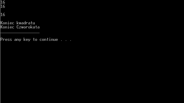 Program: obliczający pole kwadratu/czworokąta o boku długości = 4. Jak w opisie, program oblicza…