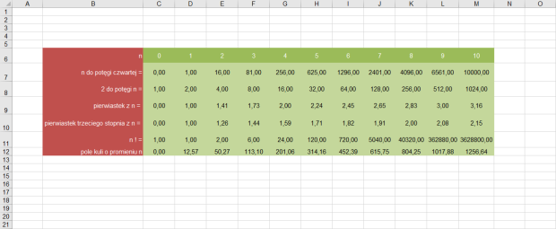 Arkusz: dokonujący obliczeń silni kopiując formułę poziomo. Skoroszyt dokonuje także kilku innych obliczeń widocznych…