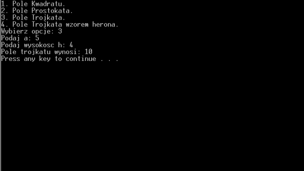 Program: obliczający podstawowe pola. Do wyboru m.in. pole: kwadratu, prostokąta, trójkąta, trójkąta wzorem Herona,…
